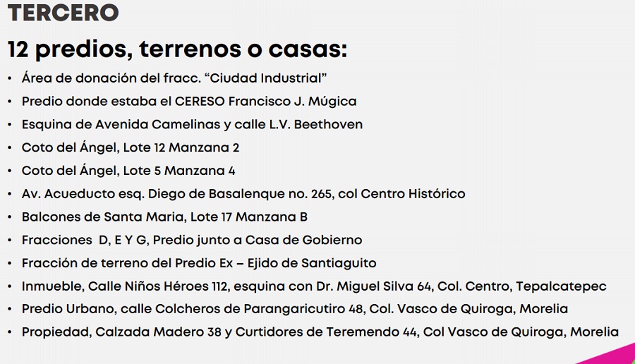 Luego de que la mañana de este miércoles Silvano Aureoles informó que pondrá a la venta cinco helicópteros y un avión, siete almacenes, 12 predios, terrenos o casas y seis predios más de grandes extensiones, ninguno sujeto a litigios, el gobierno de Michoacán ha publicado un breve catálogo con fotos de las propiedades que oferta desde hoy.