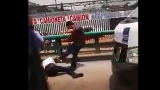 En la grabación, que fue tomada por una persona que viajaba en auto y pasó por el lugar, se puede ver cómo los dos choferes de combi golpean a un hombre que se encuentra en el suelo.