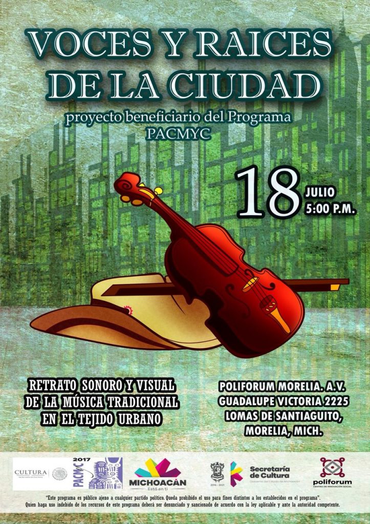 Dicho proyecto, es un retrato sonoro y visual de la música tradicional michoacana en el tejido urbano, que consiste, en documentar 6 grupos de música tradicional que han desarrollado su trabajo artístico en la ciudad; teniendo como objetivo, retratar el desarrollo de los procesos creativos de las agrupaciones.