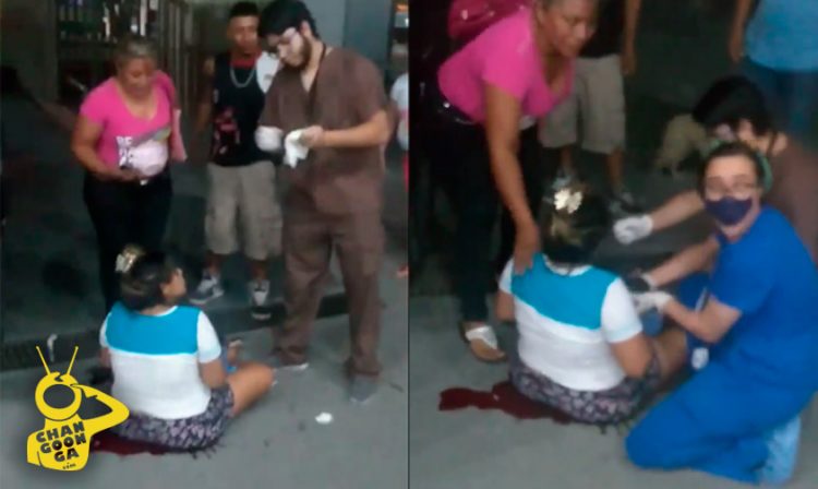 También se observa a un médico y a una enfermera que se acercan para auxiliarla, mientras varias personas exigen a gritos que la atiendan.