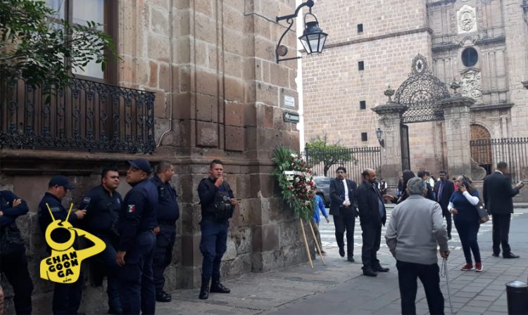 Las carrozas donde arribaron los cuerpos del secretario de seguridad pública, Martín Godoy Castro, el director del seguro popular, Germán Ortega, y los dos pilotos, se encuentra afuera de palacio al igual que algunas ofrendas florales y el sitio se encuentra custodiado por policía Michoacán.