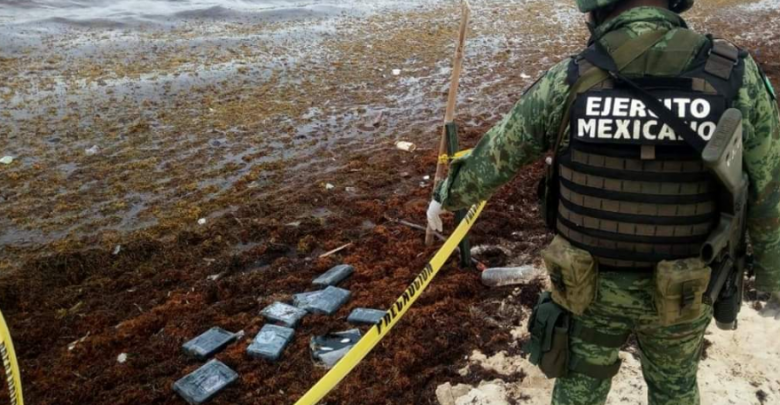 En medio de las olas de sargazo, militares encontraron varios paquetes de cocaína durante la madrugada de este viernes en Puerto Morelos, Quintana Roo.