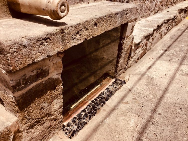 Se consolidó el interior colocando piso de piedra natural para recibir un espejo que permite leer el contenido de la lápida, este espacio de dimensiones, un metro por un metro, enmarca en su interior la raíz de un árbol, lo cual genera una atmosfera única en el lugar.