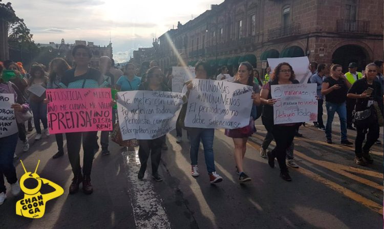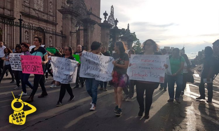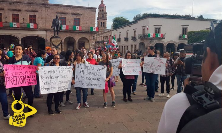 «¡Ahora mismo ahora mismo libertad al periodismo!» Es otra de las consignas con que avanzan los manifestantes hacia la fuente de Las Tarascas en reclamo por las presuntas agresiones que sufrió en días pasados la reportera de CB Televisión, Mitzi Torres de parte de agentes de la Policía Municipal de la capital michoacana.