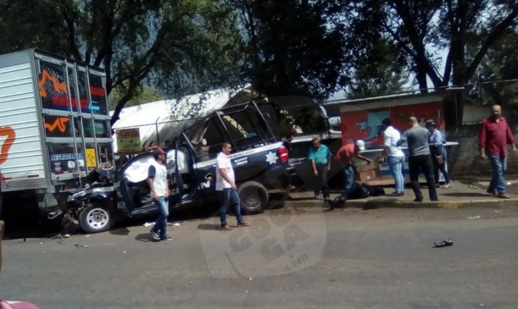 Siete policías estatales quedaron lesionados gravemente después de que la patrulla en la que iban atropelló y dejó malherido a un motociclista para enseguida impactarse contra un tráiler que estaba estacionado, esto en el Libramiento Oriente de esta ciudad Uruapan, según la información obtenida por esta agencia de noticias.