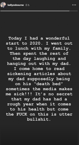 “Hoy tuve un increíble inicio de 2020. Fui a almorzar con mi familia. Después pasé el resto del día riendo y compartiendo tiempo con mi padre. Vine a casa a leer el enfermo artículo que asegura que mi padre está en su “lecho de muerte”, a veces los medios me hacen enfermar. No es secreto que la salud de mi padre fue delicada en 2019, pero esto es una mi*rda”, compartió Kelly en su Instagram.