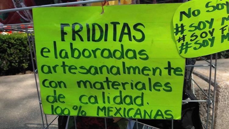 Por medio de redes sociales se han viralizado imágenes de la mujer acompañada de un carrito repleto de Friditas, además de cartulinas en las que explica que son hechas con materiales de calidad y de manera artesanal.