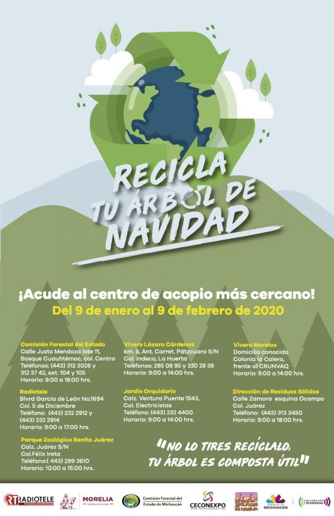En busca de fomentar la cultura de conservación y protección de nuestros recursos naturales, la Comisión Forestal del Estado (Cofom), sigue invitando a la población a sumarse a la campaña “Recicla tú árbol de navidad” en los 7 centros de acopio que operarán en la capital michoacana hasta el 9 de febrero.