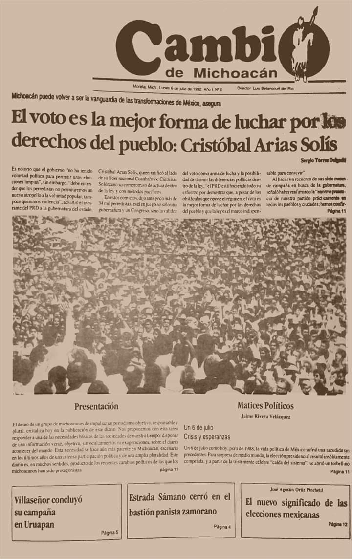 Ante esta realidad insoslayable, recordé aquella portada histórica del 6 de Julio de 1992 de su primer número en la que enaltecía una avalancha producida por el hoy Senador Cristóbal Arias Solís en Michoacán; eran los tiempos donde la transición ideológica figuraba a encaminar un nuevo sendero; sin embargo, los michoacanos conocemos esa etapa coyuntural que interrumpió la transformación social que parecía imparable. De ahí a la fecha, Cambio de Michoacán se convertiría en un fenómeno periodístico que rompió el paradigma hegemónico de algunos otros medios de renombre; el diario alcanzó altos índices de penetración en muchos puntos del territorio, porque constituía una fuente que había alcanzado la cúspide por la actitud irrestricta, moral y ética de servir a la sociedad generando información confiable.