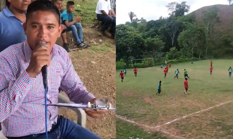 El joven, de quien aún no se tiene más información, asiste cada fin de semana a dicha cancha para narrar el partido a los pocos asistentes y lo hace con una tabla, una bocina y con un micrófono alámbrico.