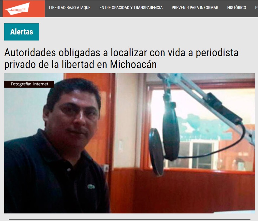 A 48 horas del reporte de su secuestro, y luego de que las autoridades no han podido localizarlo, la organización internacional que defiende la libertad de prensa, Artículo 19, emitió una alerta sobre el caso del periodista Salvador Adame Pardo, director del medio de comunicación Canal 6tv, fue privado de la libertad por un grupo armado en Nueva Italia, Michoacán.