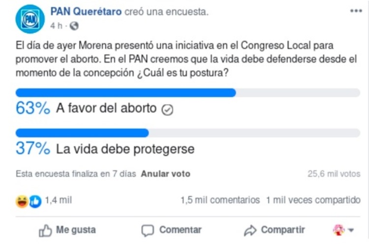La dirigencia del Partido Acción Nacional (PAN) de Querétaro publicó a través de sus redes sociales una encuesta alusiva al tema del aborto, misma que estaba programada para terminar el próximo 9 de marzo.