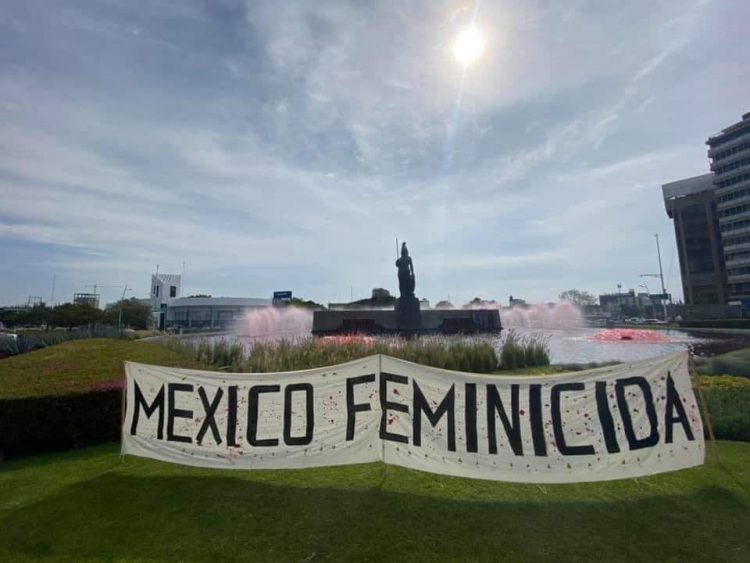 El monumento de La Minerva en Guadalajara, Jalisco, se vistió de rojo este sábado, ya que la agua de la fuente fue pintada de ese color, además de una manta donde se lee “México Feminicida”.