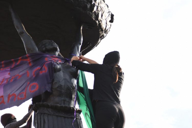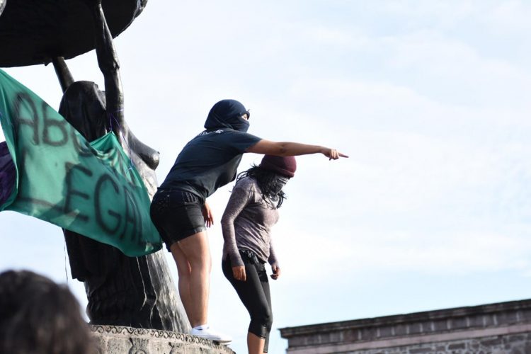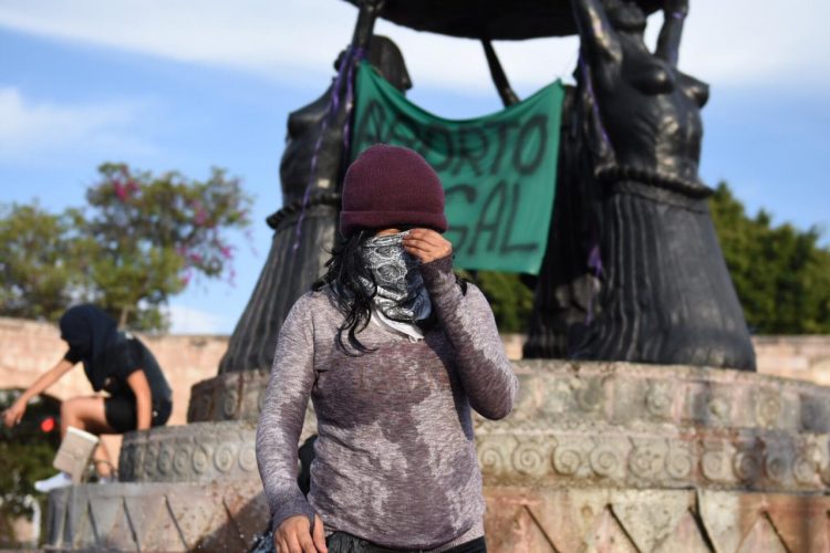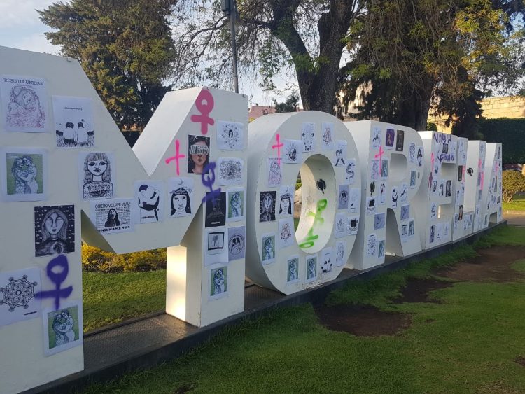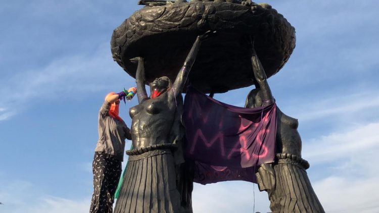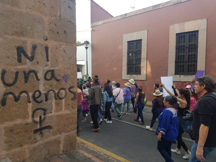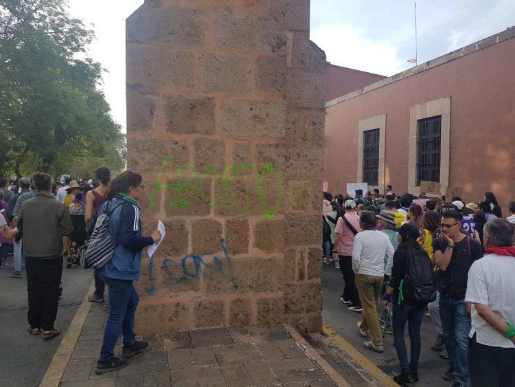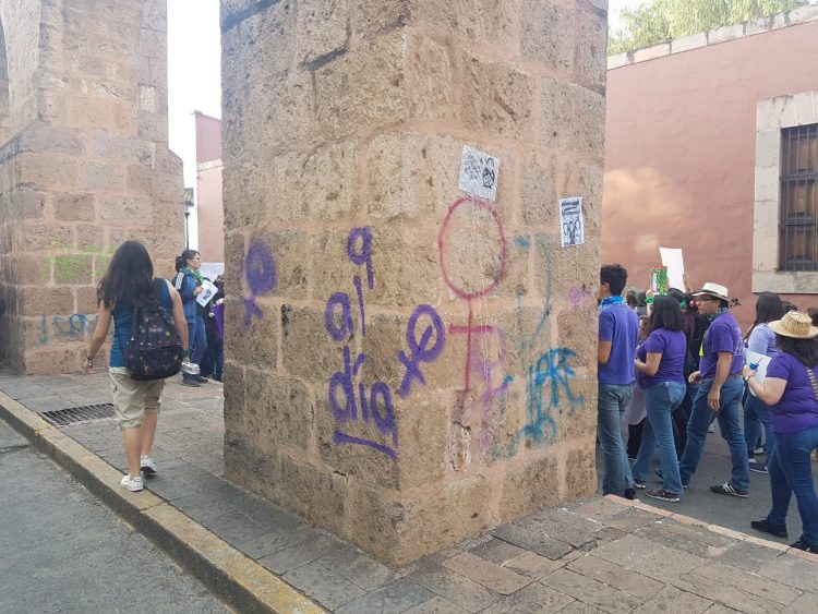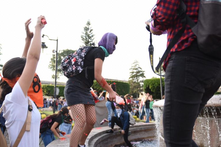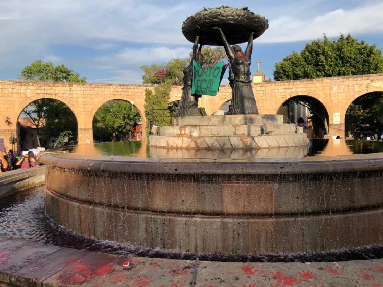 Bajo consignas de ¡el patriarcado se va a caer se va a caer!” y con mensajes proaborto y libre decisión sobre su cuerpo, además de denuncias contra la violencia hacia las mujeres, feministas del ala radical en Morelia procedieron a realizar pintas a lo largo de Acueducto, en inmuebles de la avenida Madero, quebrando vidrios en el Congreso del Estado y tiñendo el agua de la fuente de Las Tarascas a las cuales les fueron colgadas femimantas.