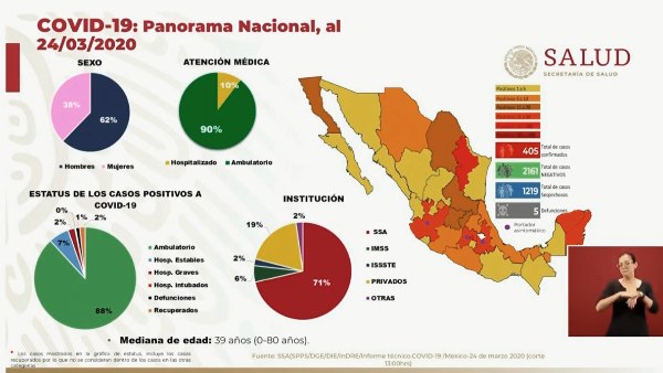 En conferencia de prensa desde Palacio Nacional, este martes la Secretaría de Salud actualizó a 405 los casos confirmados de coronavirus en México, el doctor José Luis Alomía, director de Epidemiología y vocero de COVID-19 en el país, informó que hay 1219 casos sospechosos de infección.