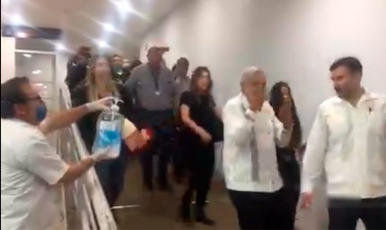 Además de no respetar la sana distancia, una vez más se evidenció que el mandatario rechazó gel antibacterial cuando se le ofreció al arribar a la terminal aérea de Nayarit.