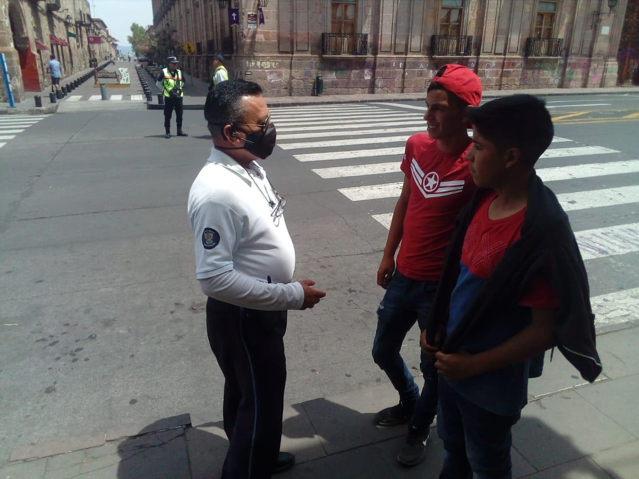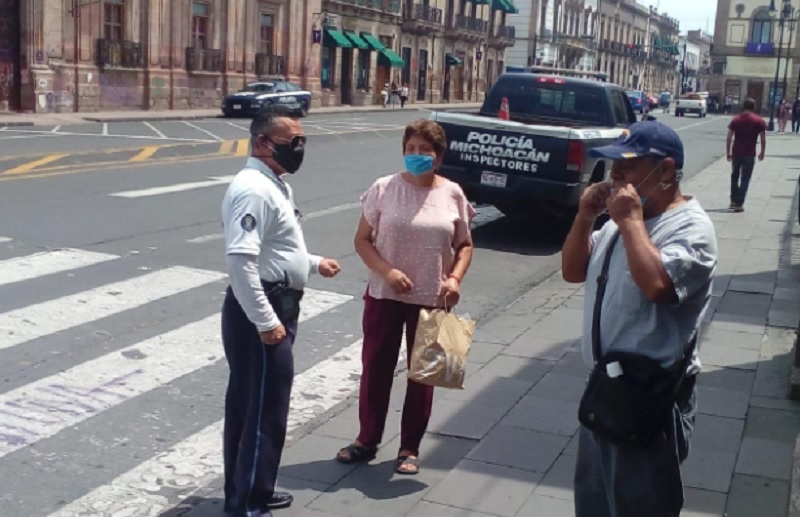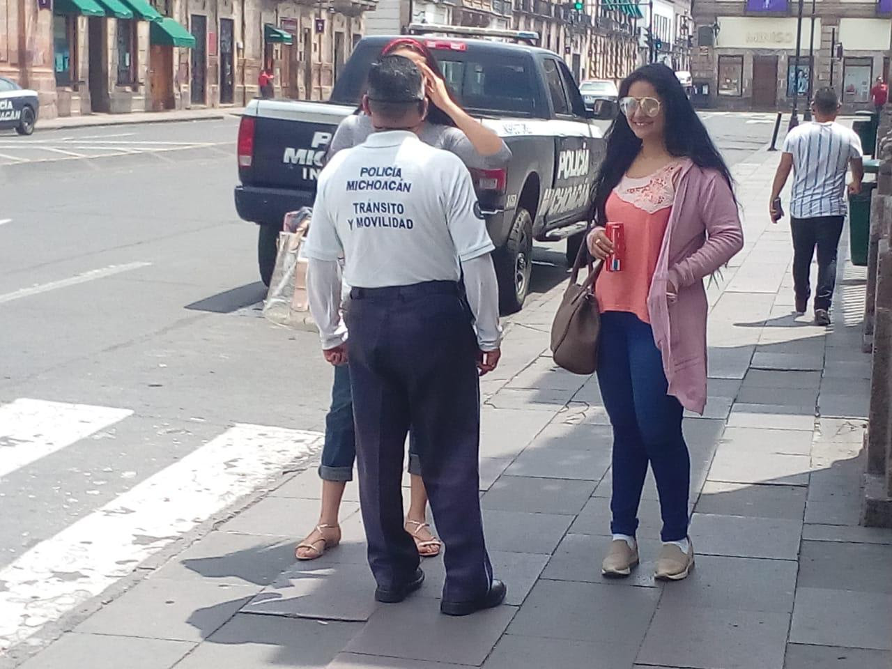 Elementos de Tránsito y Movilidad de la Policía Michoacán mantienen presencia en la zona Centro de esta ciudad, donde llevan a cabo trabajos de difusión, invitando a la ciudadanía a evitar salir de su casa, así como visitar lugares públicos, para frenar la propagación del virus.