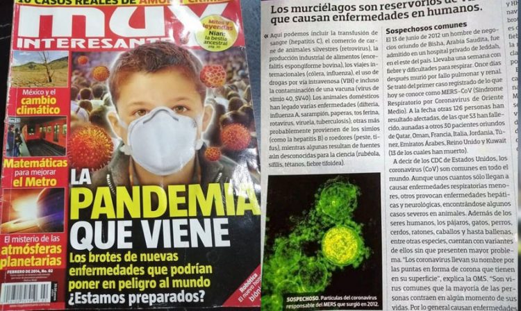 “El causante del MERS-CoV; provoca síntomas de fiebre, tos y dificultad para respirar, y casi la mitad de los pacientes muere; un dato clave es que éste es muy similar a los que podemos encontrar en murciélagos”, explicaba la revista al hablar sobre un virus de murciélagos y los efectos que ocasionaba en las personas.