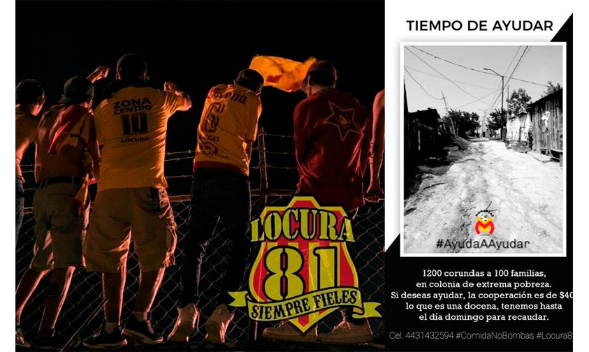 “Es tiempo de ayudar”, así comienza el mensaje que distribuyen los integrantes de la “Locura 81”, barra de animación del equipo de futbol Monarcas Morelia.