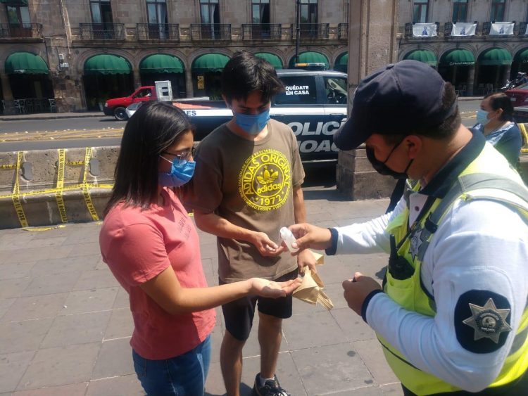 De igual manera, el personal policial realiza la dispersión de gel antibacterial a transeúntes y automovilistas, invitándolos a permanecer en sus domicilios y seguir las medidas de higiene para evitar contagios, como lavarse las manos constantemente con agua y jabón, utilizar gel antibacterial y cubrebocas de manera obligatoria.