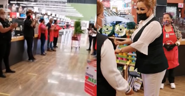 La trabajadora de la salud va camino a la salida, pero, antes de abandonar el lugar, algunos trabajadores de la tienda hicieron un pasillo para despedirla entre aplausos, porras y cumplidos, este video ha logrado viralizarse rápidamente.