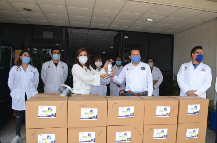 Investigadores y alumnos del plantel entregaron a Rodea Pimentel, además, caretas y gel a base de alcohol elaborados por ellos mismos, a fin de contribuir con las labores que realiza el personal de salud.