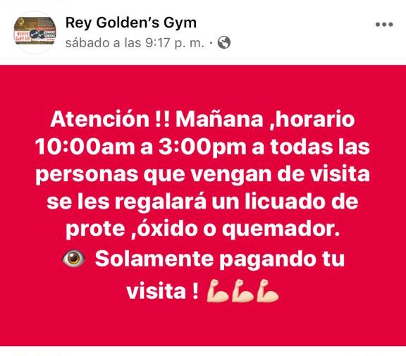 “Atención !! Mañana ,horario 10:00am a 3:00pm a todas las personas que vengan de visita se les regalará un licuado de prote, óxido o quemador.