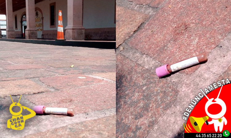 A través de una denuncia anónima hecha a la redacción de Changoonga.com, se dio a conocer que alguien desechó un tubo de muestras de laboratorio a las afueras de las oficinas de la comisaría de la Policía municipal de Morelia, ubicada en el centro histórico.