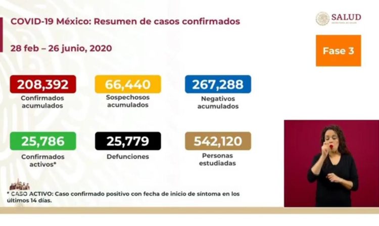 José Luis Alomía, Director General de Epidemiología, informó que este viernes 26 de junio, México alcanzó los 25, 779 decesos por COVID-19. Además hay 208,392 contagios acumulados desde que inició el primer caso positivo el febrero pasado.