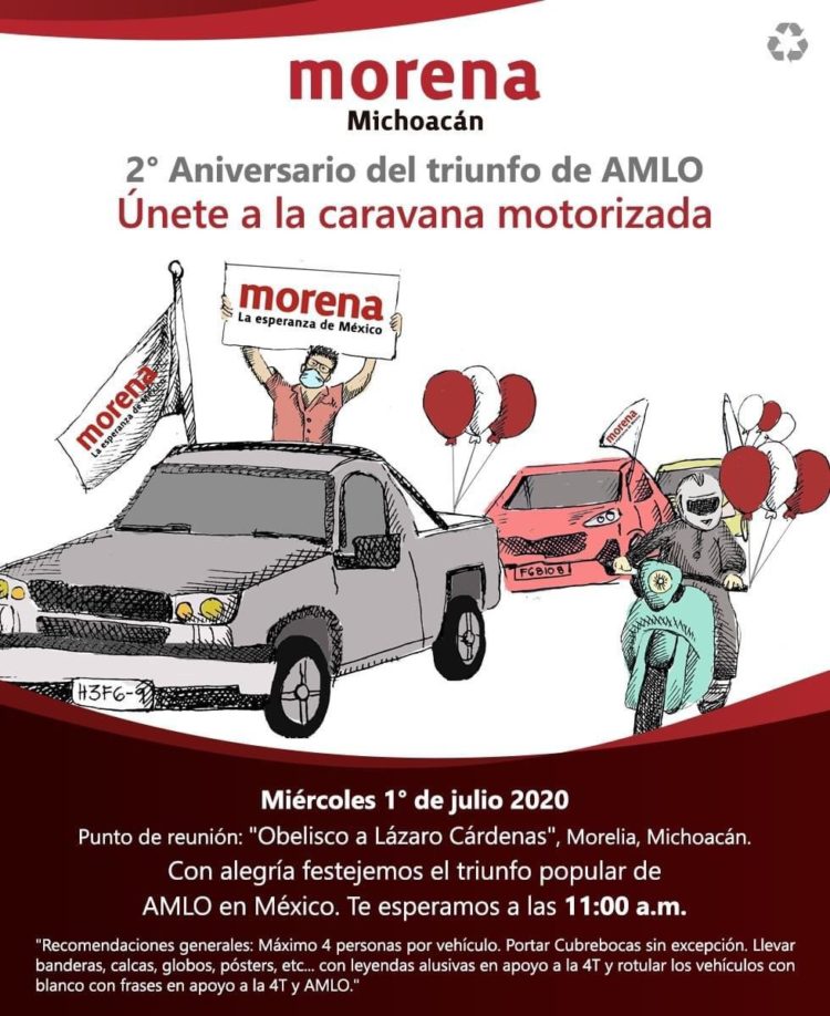 A través de redes sociales,Osvaldo Ruiz Ramírez, regidor por la bancada de Morena convocó a la ciudadanía en general a una caravana en auto para celebrar el segundo aniversario del triunfo del presidente de México, Andrés Manuel López Obrador.
