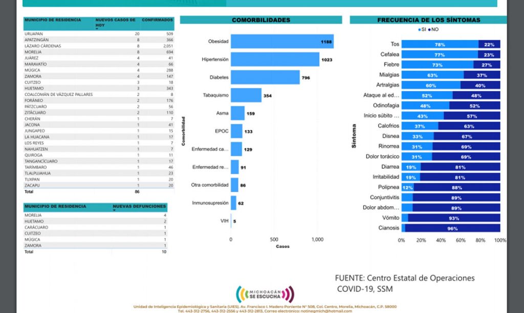 El reporte que emite la Secretaría de Salud, pone a Uruapan con el mayor número de contagios con 20 de 509 que tiene en global.