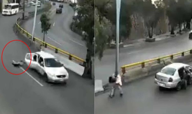 Una cámara de seguridad captó el momento en que un niño sale volando de un auto en movimiento en el bulevar Adolfo López Mateos de la ciudad de Zacatecas.