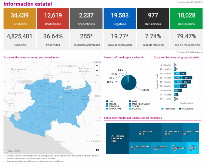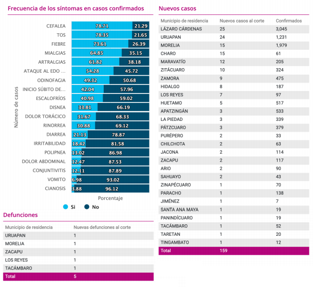 Según el reporte que emite la Secretaría de Salud (SSM), este día aumentaron 159 casos y 5 defunciones, siendo Lázaro Cárdenas el municipio que más casos registró con 25, mientras que Uruapan tuvo 24.