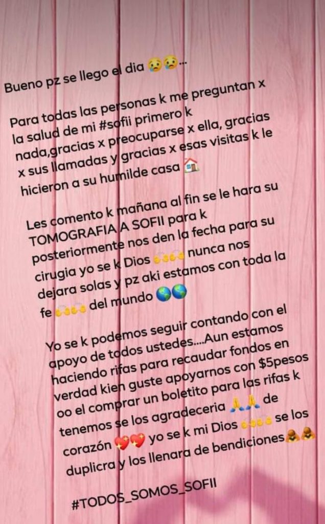 A través de la siguiente página de Facebook también se pueden pedir informes para poder ayudar a Sofi en sus gastos médicos: https://www.facebook.com/Recaudacion-y-donaciones-para-servicios-medicos-para-Sofi-100210821790212/