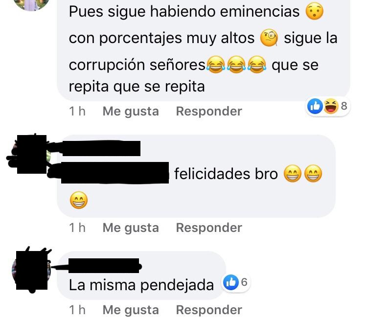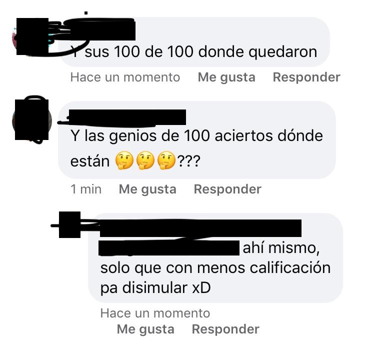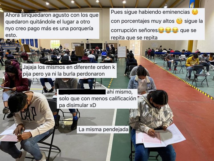 Se leen comentarios como: “Pues igual señores los alumnos siguen siendo eminencias con 96 aciertos el primero y con 95 los siguientes 4 y con 94 los siguientes 4”; en este tipo de comentarios se hace alusión a que el proceso continúa viciado desde las entrañas de la Secretaría de Educación del Estado.