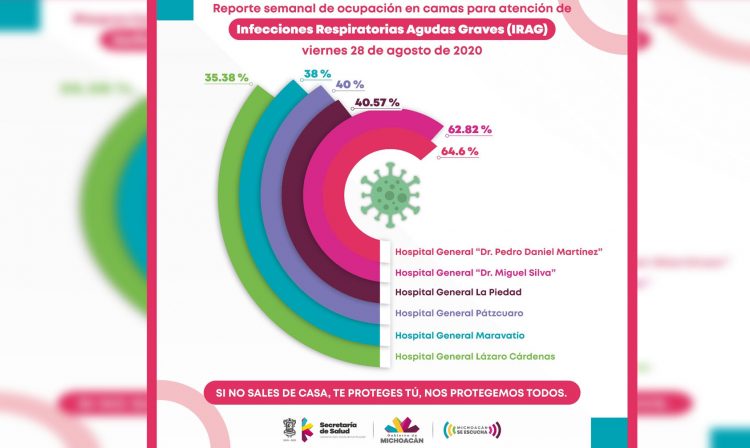 Derivado del comportamiento epidemiológico por la contingencia sanitaria de COVID-19, las camas reconvertidas de seis Hospitales Generales de la Secretaría de Salud de Michoacán (SSM), para la atención de Infecciones Respiratorias Agudas Graves (IRAG), registran una ocupación de entre 35 a 64 por ciento.