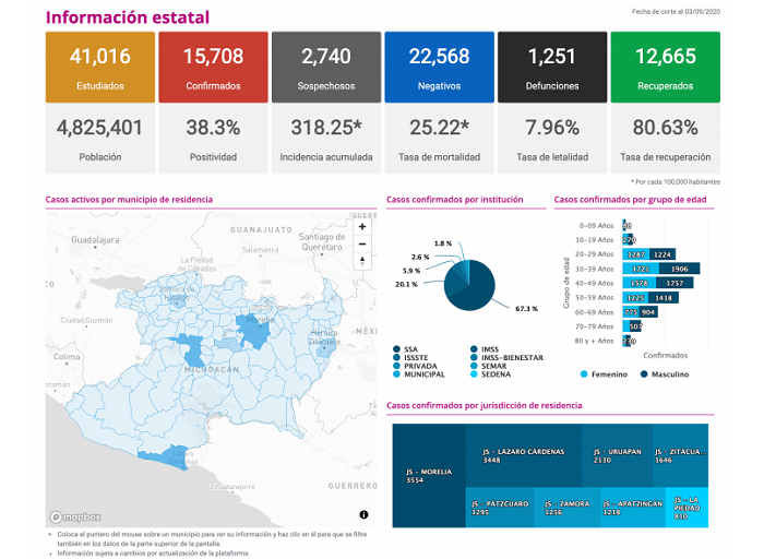 De acuerdo con el informe diario proporcionado por la Secretaría de Salud de Michoacán (SSM), en el estado ya se contabilizan 15 mil 708 casos confirmados y 1 mil 251 lamentables fallecimientos por la enfermedad.