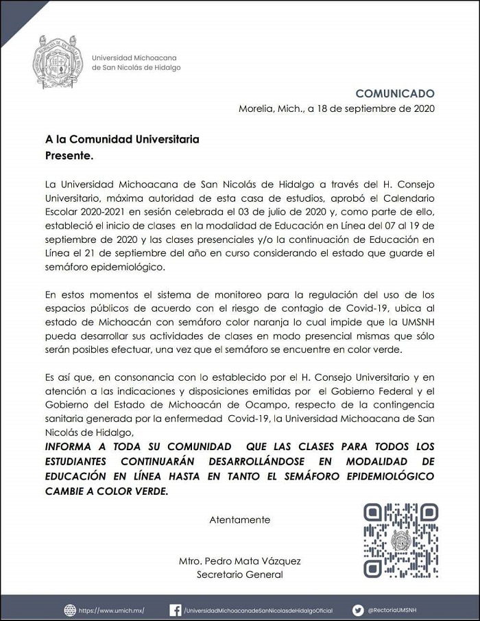 A través de un comunicado difundido por redes sociales, la Universidad Michoacana de San Nicolás de Hidalgo (UMSNH) dio a conocer que a pesar de que se tenía contemplado el regreso a clases presenciales para este lunes 21 de septiembre, debido a la pandemia de coronavirus (COVID-19) se deberá posponer un poco más.