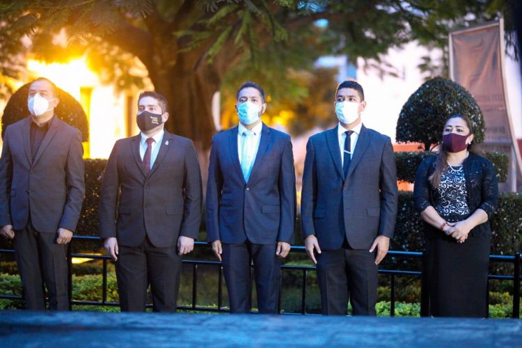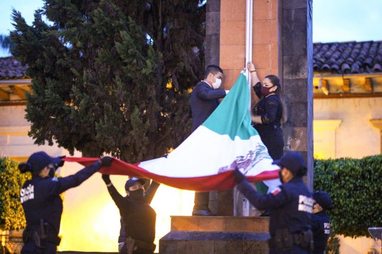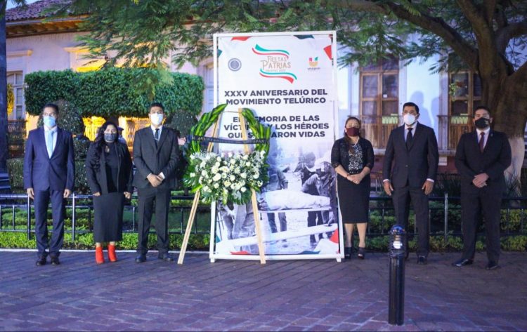 En señal de luto, el Pendón Tricolor fue izado a media Asta por el alcalde de Uruapan y por la Presidenta Ejecutiva de la H. Junta Cívica y Patriótica Municipal 2020, María Eréndira Zacarías Zepeda, quienes después de entonar el Himno Nacional, colocaron la ofrenda floral y montaron guardia de honor en recuerdo de quienes fallecieron en los movimientos telúricos señalados en compañía de regidores.