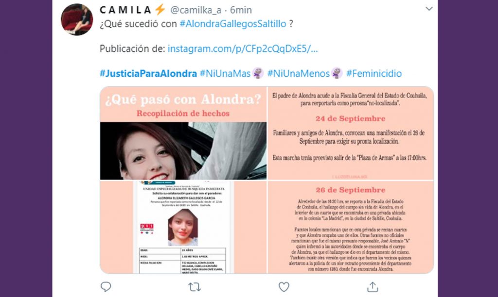 “Minutos antes de iniciar manifestación convocada por familiares de Alondra recibimos la triste noticia, fue encontrado su cuerpo sin vida. Urge acuerpamiento en Plaza de Armas, Saltillo. ¡No estamos todas, nos falta Alondra!” (sic), informó.