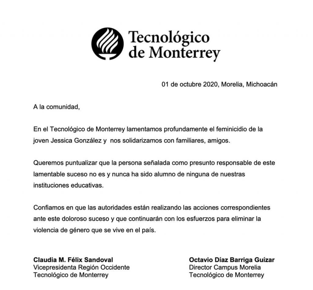 Luego de que trascendiera que Diego Urik “N”, quien es señalado como el presunto feminicida de la joven moreliana Jessica González Villaseñor, aparentemente cursaba sus estudios superiores en el Tec de Monterrey, ha sido la propia universidad la que ha salido a desmentir dicho rumor.
