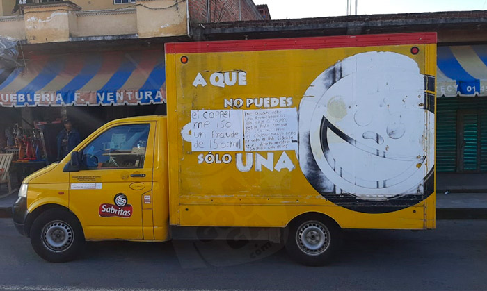 En las pancartas que han colocado de puede apreciar la denuncia de los comuneros, en la que resalta que un empleado de Coppel le dijo al denunciante que no podía retirar el dinero hasta el día siguiente.