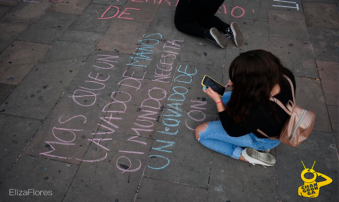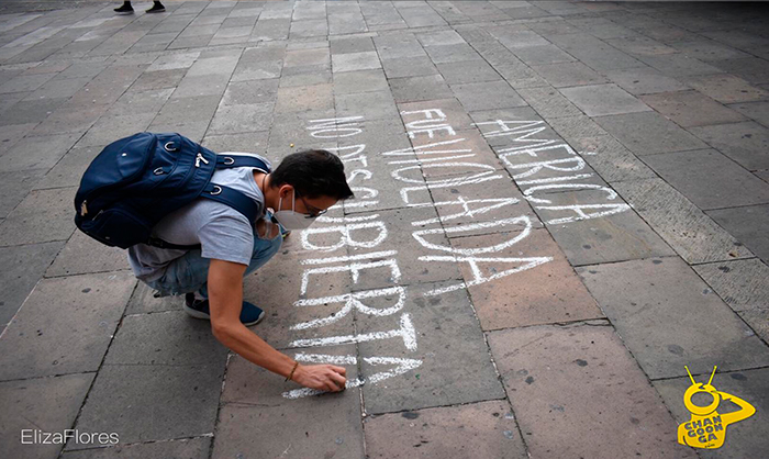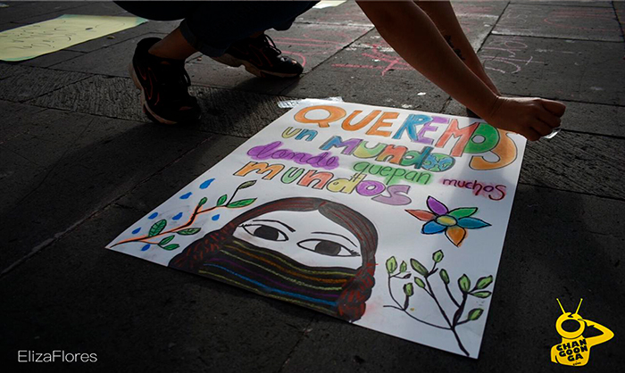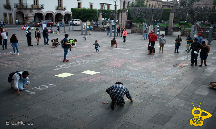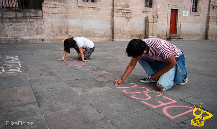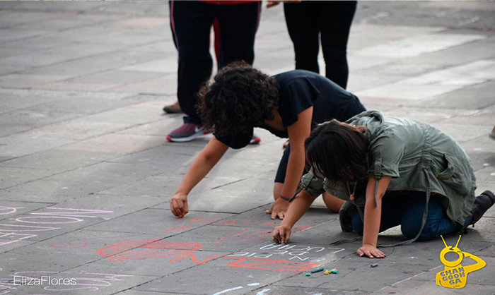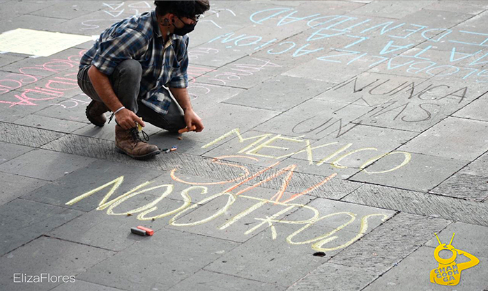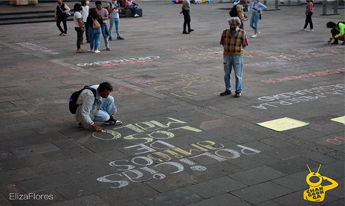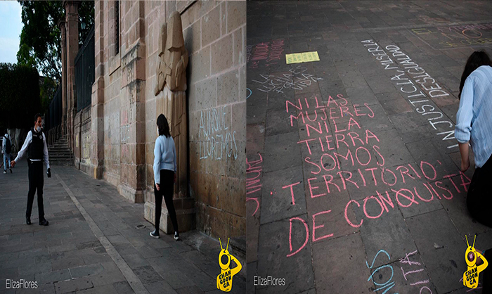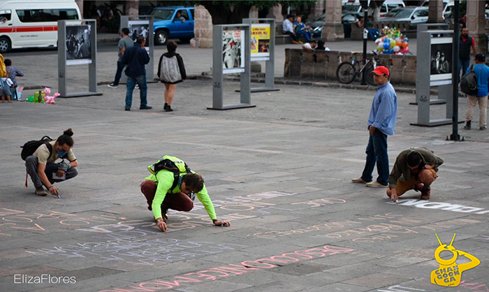 Con gises se dieron a la tarea de escribir algunos mensajes para los transeúntes, entre los que se pueden leer “Por un mundo donde quepan muchos mundos”, “Con rezar no se cambia el país”, “Los pueblos fueron y siguen siendo asesinados”, “La lucha es colectiva”, entre otras.
