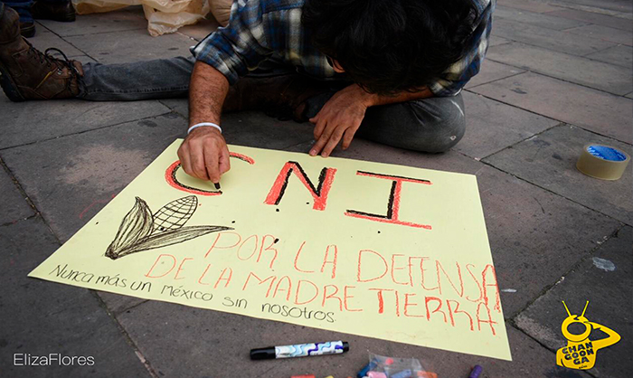 Mediante una bocina pequeña y un micrófono invitan a la ciudadanía a plasmar sus sentires, en el piso o en cartulinas, también colgaron una manta en la que manifiestan que están en contra de los mega proyectos y piden un alto a la guerra, firmada como “El EZLN”.