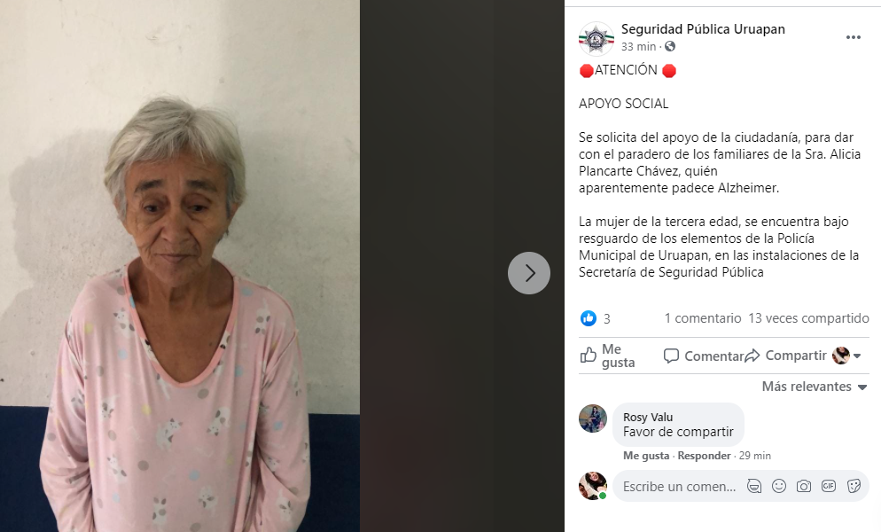«Se solicita del apoyo de la ciudadanía, para dar con el paradero de los familiares de la Sra. Alicia Plancarte Chávez, quién aparentemente padece Alzheimer», escribieron en sus redes sociales