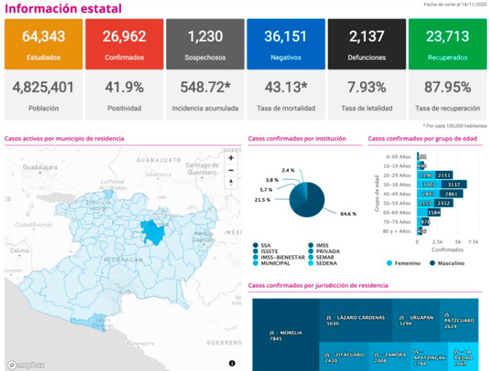 Hasta este lunes, se han confirmado un total de 26 mil 962 casos confirmados en Michoacán y 2 mil 137 defunciones por el COVID-19.