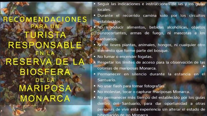 Entre las medidas se puede observar la reducción en tiempo de colonias, no lavarse las manos en cuerpos de agua porque ya se trae gel o sanitizante, no tirar los cubrebocas en la reserva, no usar spray y gel cerca de la colonia para no afectar las mariposas, no acudir si se está enfermo o en mayor de 60 años o menor de 12.