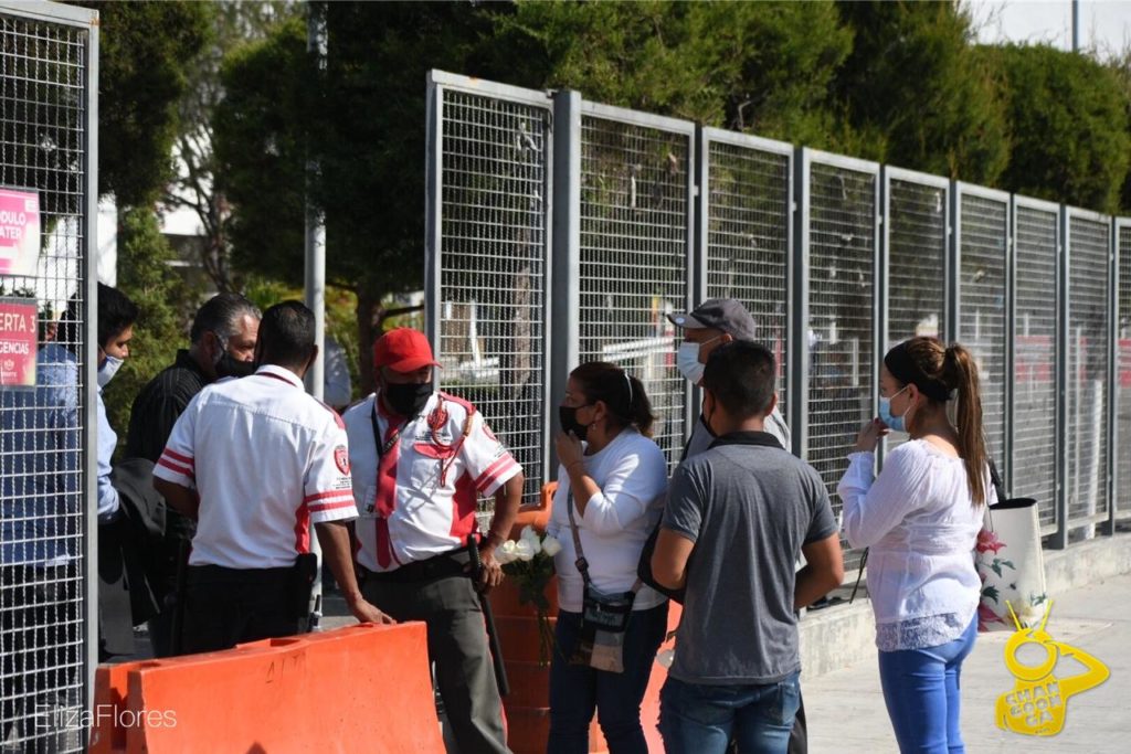Personas están a la espera de la salida de la carroza fúnebre del Doctor Míreles, la familia se encuentra al interior del hospital en un espacio alejado de las puertas y de la prensa.