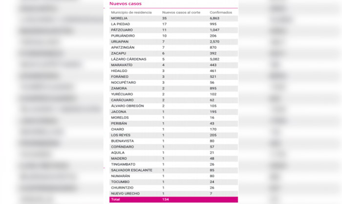 Morelia, La Piedad y Pátzcuaro son los municipios con mayor índice de contagios este jueves con 35, 17 y 11 casos de COVID-19 respectivamente.