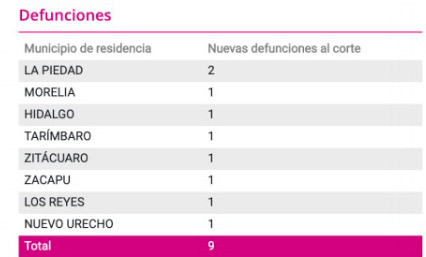 Las muertes se vivieron 2 en La Piedad y 1 en Morelia, Hidalgo, Tarímbaro, Zitácuaro, Zacapu, Los Reyes y Nuevo Urecho.